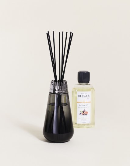 Het Amphora Noir Scented Bouquet is door zijn elegantie zelfvoorzienend. Deze rondingen roepen zachtheid op en eindigen in een metalen ring waaruit een paar geurende lokken opstijgen. Het zwarte semi-transparante glas laat je je ogen onderdompelen in deze statische schoonheid met zijn unieke enigmatische ontwerp. Deze soberheid contrasteert met het fruitige parfum Lait de Figue, dat gastronomische, zachte en brutale tonen onthult. Vijgenmelk, het hoofdingrediënt van deze geur, biedt je met zijn zachte melkachtige geuren het begin van een mooi moment van ontspanning. De bloemige geuren van iris en lotus versterken de exquise fruitige geuren van zwarte vijg. De zonnige en warme kant wordt geleverd door kokoswater, patchouli en sandelhout in de basisnoten.