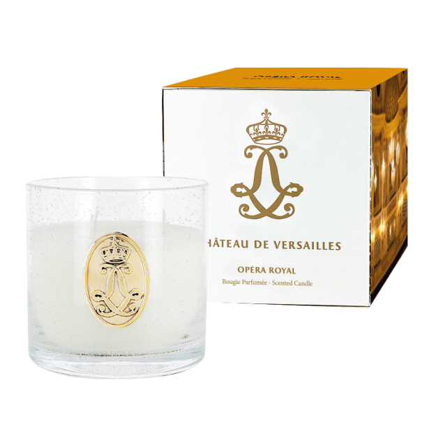 Het Château de Versailles® besloot om voor zijn gelijknamige collectie kaarsen onze hulp in te roepen. De houders van bubbelglas zijn vervaardigd door uiterst vakkundige glasmeesters en de was is handmatig gegoten, wat deze uitzonderlijke creaties hun authentieke ambachtelijke karakter geeft. Van de bewerking van het parfum tot de uitvoering van de verpakking vindt u in deze producten een kwaliteit en een vakmanschap die uniek zijn, zonder het vleugje elegantie te vergeten. In de Koninklijke Opera, waar de meest indrukwekkende feesten gehouden werden en de mooiste voorstellingen gegeven werden waar de Koning zo dol op was, werden ook muziekstukken gecomponeerd. Om deze getuige van de geschiedenis te eren, is de geurkaars Opéra Royal zeer gekunsteld, boordevol ingrediënten, zeer gefaceteerd met reliëf en voldoende volume om deze immens grote zaal te vullen. Het geurspoor begint met de frisse, aromatische noten van alsem, die enigszins worden afgeremd door de blaadjes van kaneel. Het Guajac-hout zorgt voor een stoer karakter, met de licht rokerige geur van wierook. De rode vruchten geven een vrolijk gourmand accent. En het parfum eindigt met een hoogtepunt van houtachtige accenten met een vleugje vanille en honing.