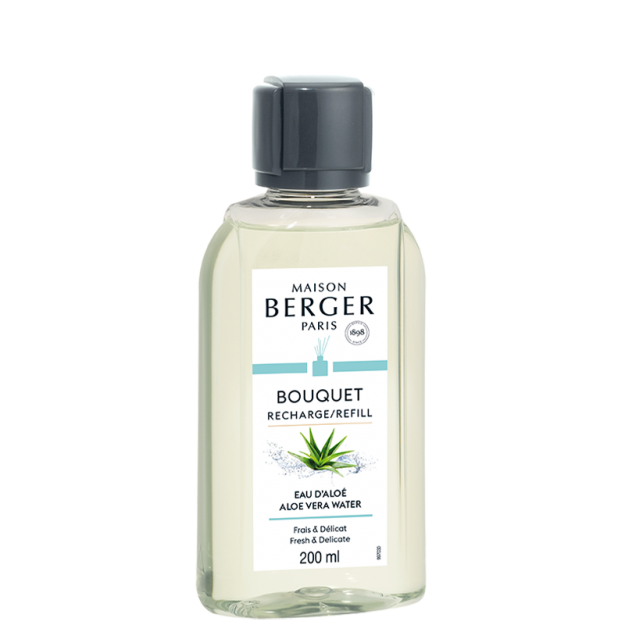 De Aloe Water Bouquet Refill 200ml met zijn prachtige plantaardige transparantie wordt gewaardeerd om zijn elegantie en lichtheid. De zuiverheid van aloë vera, het belangrijkste ingrediënt van de compositie, gaat gepaard met de groene frisheid van bamboebladeren en wat pittige citrustonen. De geur bloeit dan met het exotisme van lotusbloem en waterlelietje-van-dalen om te eindigen met warme akkoorden van sandelhout, witte musk en tonkaboon. Creëer je geurige tuin om innerlijke rust te vinden en transformeer zo je huis in een natuurlijk bijgebouw. Deze 200 ml Aloe Water Bouquet Refill past perfect bij het Ice Cube Perfumed Bouquet en vormt zo een elegant duo. De aromatische en poëtische geur verspreidt zich door de kamer en zorgt voor een stralend gevoel van frisheid.