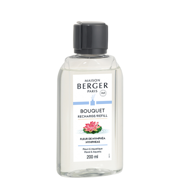 Met het parfum voor Bouquet Fleur de Nymphéa, ook wel bekend als Fleur de Lotus, geeft Maison Berger Paris ons zijn visie op dit bloemige "fenomeen". De frisse en citrusachtige topnoten kondigen een lichte en verkwikkende reis aan. Het delicaat bloemige hart zorgt voor een zachte pauze. De aquatische tonen, de zuiverheid van de waterlelie nodigen uit tot serene introspectie, en het poëtische moment gaat verder op een achtergrond van witte ceder, voor een luchtballet, een beetje hypnotiserend.