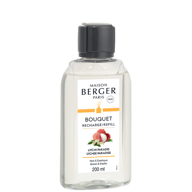 De Navulling 200ml Parfumverspreider Litchi Paradis van Maison Berger Paris is als een waterval van frisheid en al het fruit dat de aarde erin draagt..
