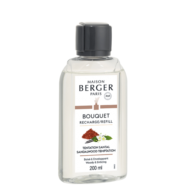 De navulling 200ml Parfumverspreider Tentation Santal van Maison Berger Paris onthult een fleurig, subtiel kruidige parfumcompositie van kardemom en roos, benadrukt door een snufje sandelhout.