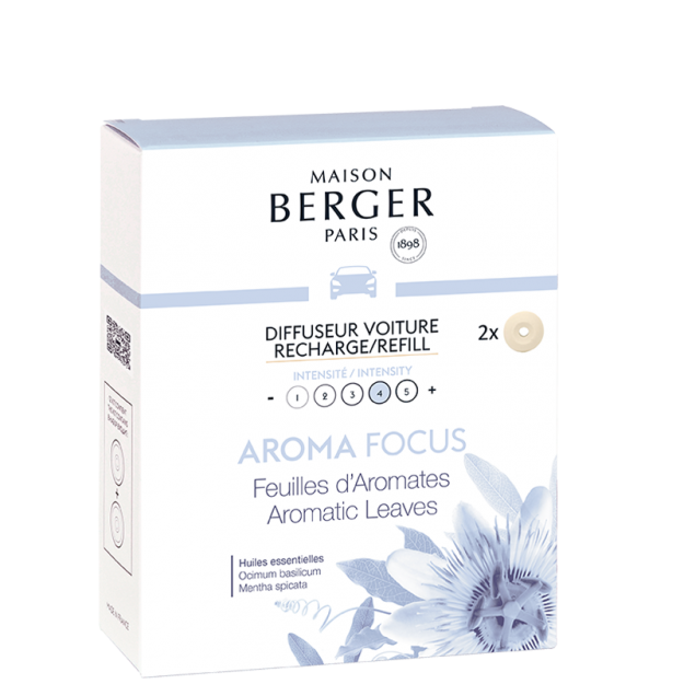 De Aroma Focus Car Diffuser Refills met Aromatic Leaves geur zijn verrijkt met essentiële oliën van pepermunt en rozemarijn. Hun aromachologische deugden helpen om je concentratie te bevorderen. De natuurlijkheid van de groene noten wordt gecombineerd met de aromatische moderniteit van rozemarijn. Dan vormen de stimulerende pepermunt, de geuren van steranijs en de krachtige geur van basilicum een explosief mengsel. Kruidnagel en basilicum sluiten de compositie af op een kruidige toon met mediterrane accenten. Aan het stuur is het belangrijk om gefocust te blijven! Dit geurige intermezzo, vol puurheid, neemt je mee naar de meest betoverende aromatische tuinen. Deze Aroma Focus Car Diffuser Refills hebben een sterke geurintensiteit, beoordeeld met 4 uit 5. Verkocht in een verpakking van 2, elk keramiek heeft een levensduur van ongeveer 4-6 weken. Andere geuren uit de Aroma collectie zijn verkrijgbaar in autogeur navullingen.