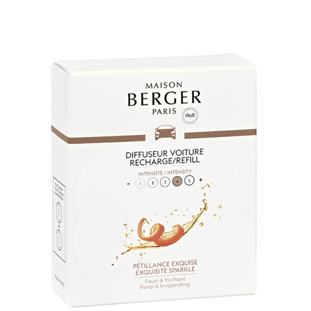 Deze box is een uitnodigingskaart, de officiële aankondiging van een niet te missen feest. Het is ook een demonstratie van Franse knowhow en kwaliteit. De 2 Exquisite Sparkle-keramiek zal uw Bestsellers-autodiffusor effectief opladen, een object met een trendy uitstraling met zijn honingraatpatroon en de schittering van zijn chroomkleur. Het door Maison Berger Paris ontwikkelde proces zorgt voor een homogene en subtiele verspreiding. Het parfum is speciaal bestudeerd voor deze manier van verspreiding en met uitmuntendheid ontwikkeld door de meesterparfumeurs van Grasse.